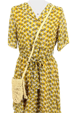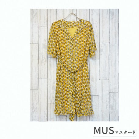 レトロ花柄ワンピース フリーサイズ マスタード/ネイビー 花柄ジョーゼット 【即納】